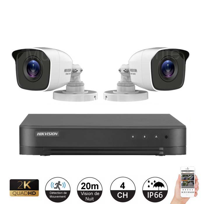 Ces 2 caméras bullet Hikvision de la série HiWatch convient à une utilisation en intérieur. La résolution HD 4Mp (2560×1440), garantit des images de caméra nettes. Grâce à l’objectif de 2,8 millimètres, la caméra a un grand angle de vision de 103 degrés. La caméra peut être utilisée dans quatre techniques : CVI, TVI, analogique et AHD. Dans l’obscurité, la caméra passe en éclairage infrarouge. La vision nocturne atteint jusqu’à vingt mètres. L’appareil photo a plusieurs fonctions qui garantissent que vous avez toujours des images utilisables de bonne qualité. Vous pouvez monter le dôme sur un plafond ou un mur. La caméra Hikvision est de petite taille et ne peut être utilisée qu’à l’intérieur. A cela s’ajoute un enregistreur numérique full HD de 1080P pour 4 caméras avec 25 images par seconde et par caméra. Que vous vous situez en France ou a l’étranger il est possible de visualisé en direct et a distance a partir d’un smartphone, tablette ou pc